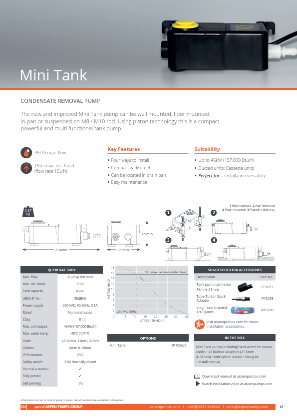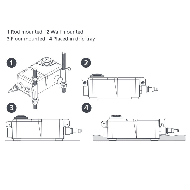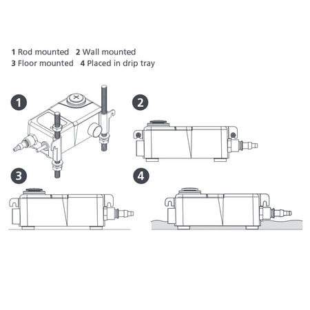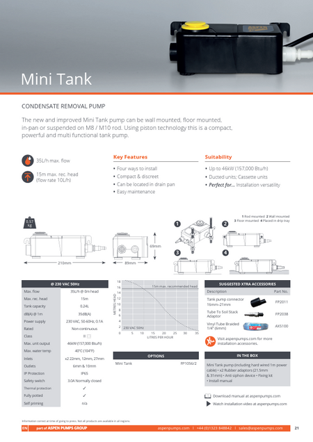 The new and improved Mini Tank pump for air conditioning units up to 46kW. can be wall mounted, floor mounted, in-pan or suspended on M8 / M10 rod.